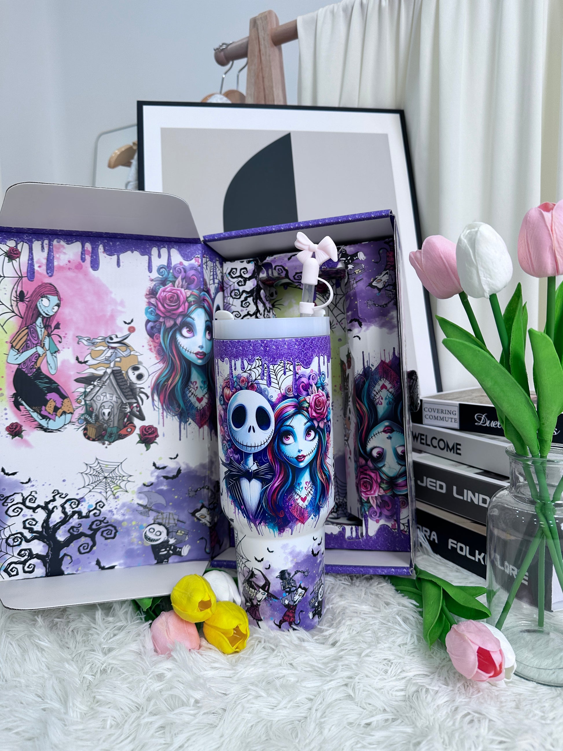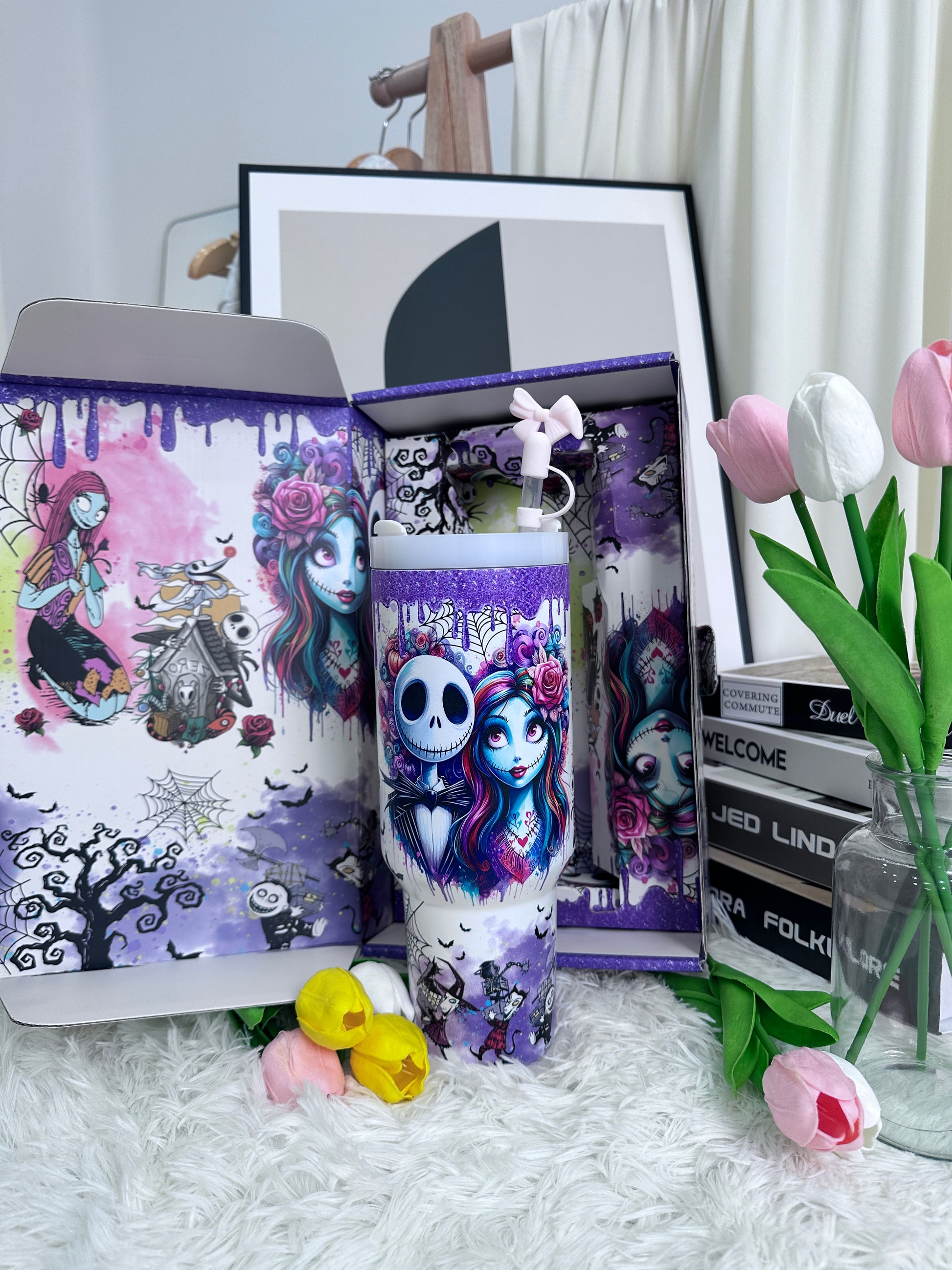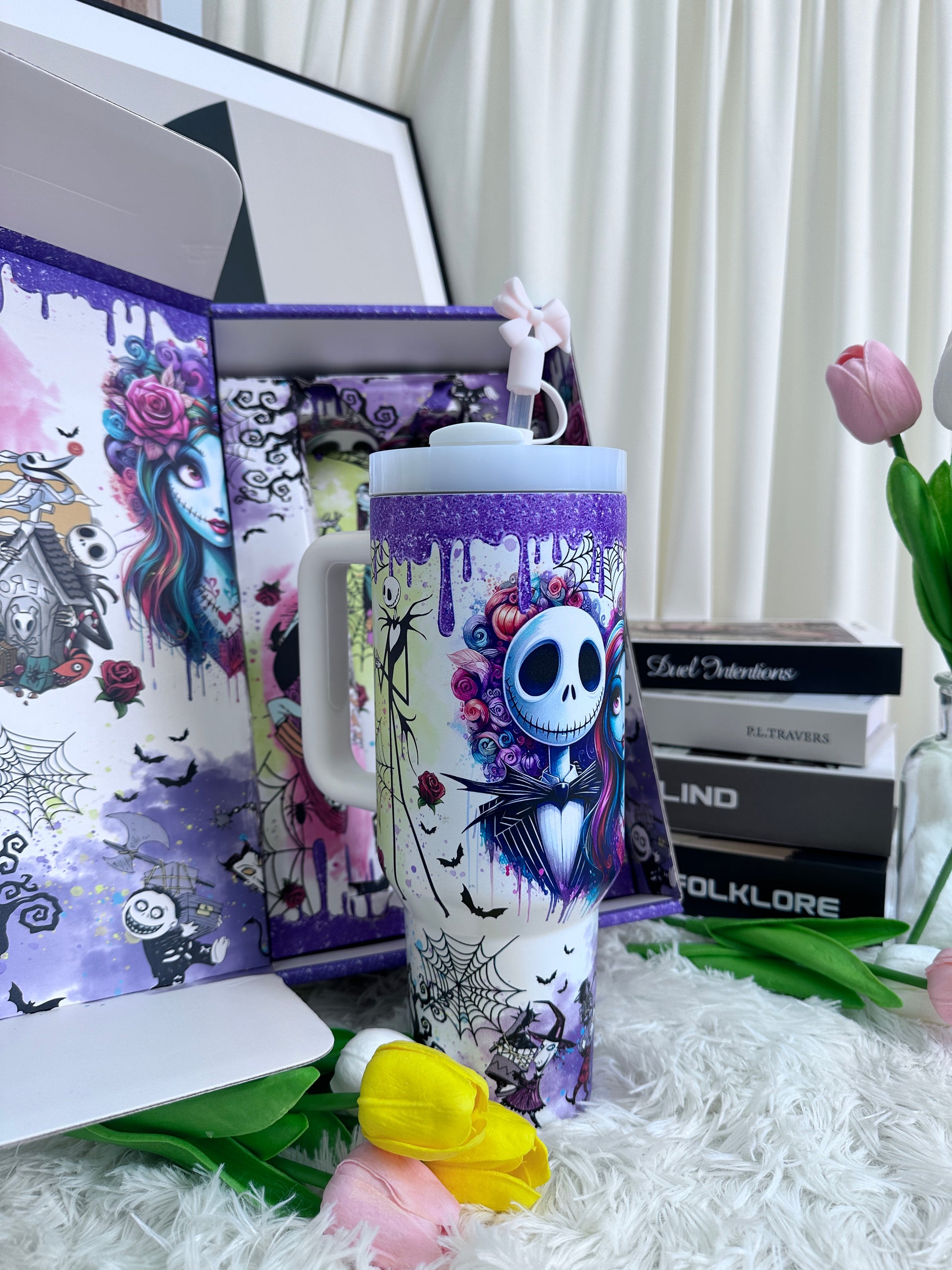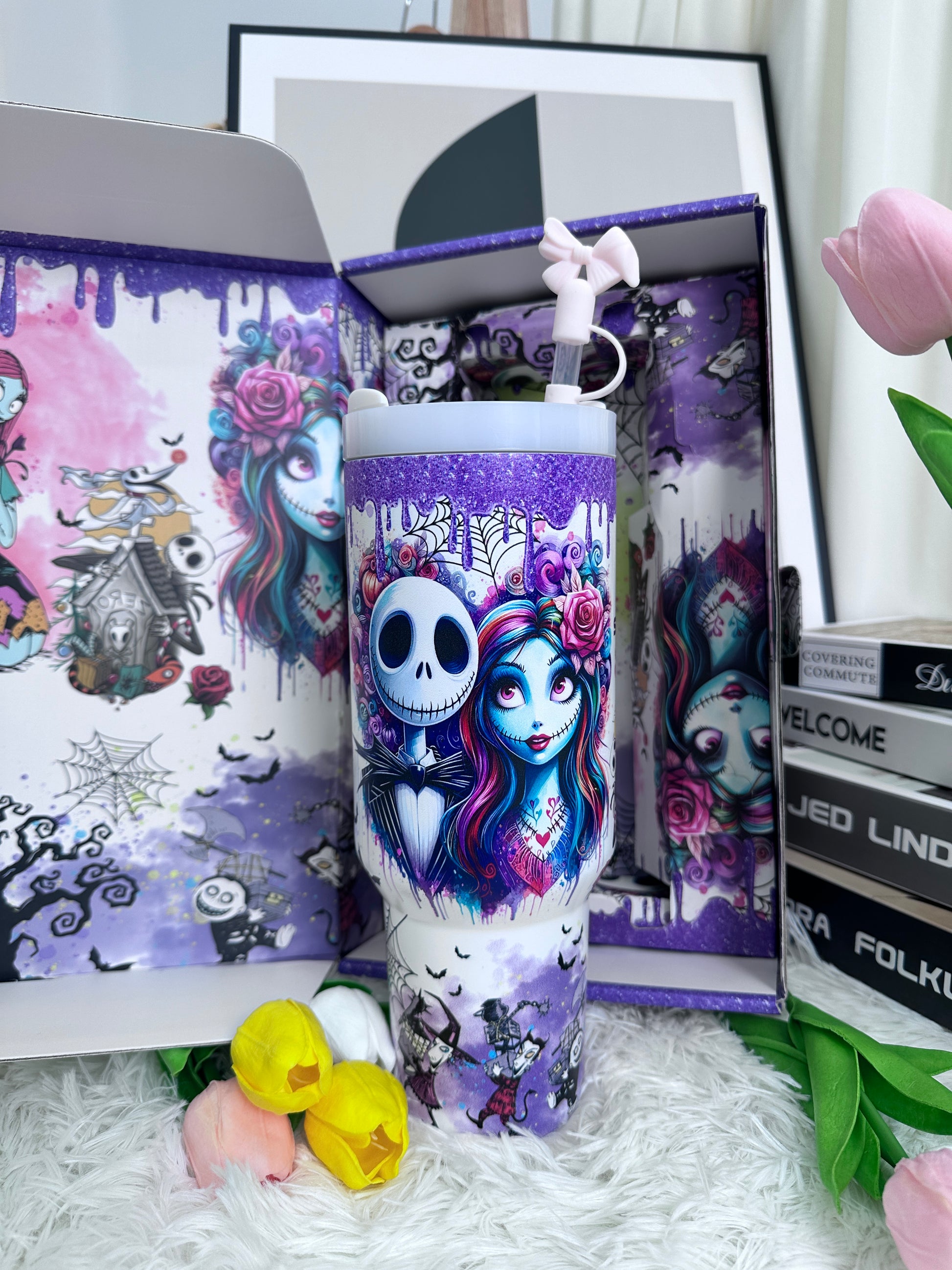 The cup features a dreamy purple gradient finish with whimsical artistic illustrations, creating a stylish yet playful look.