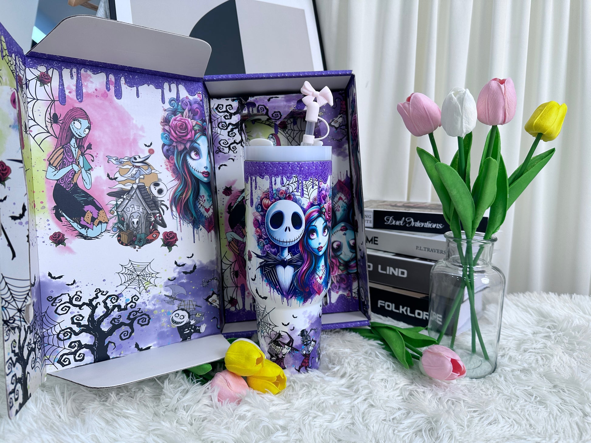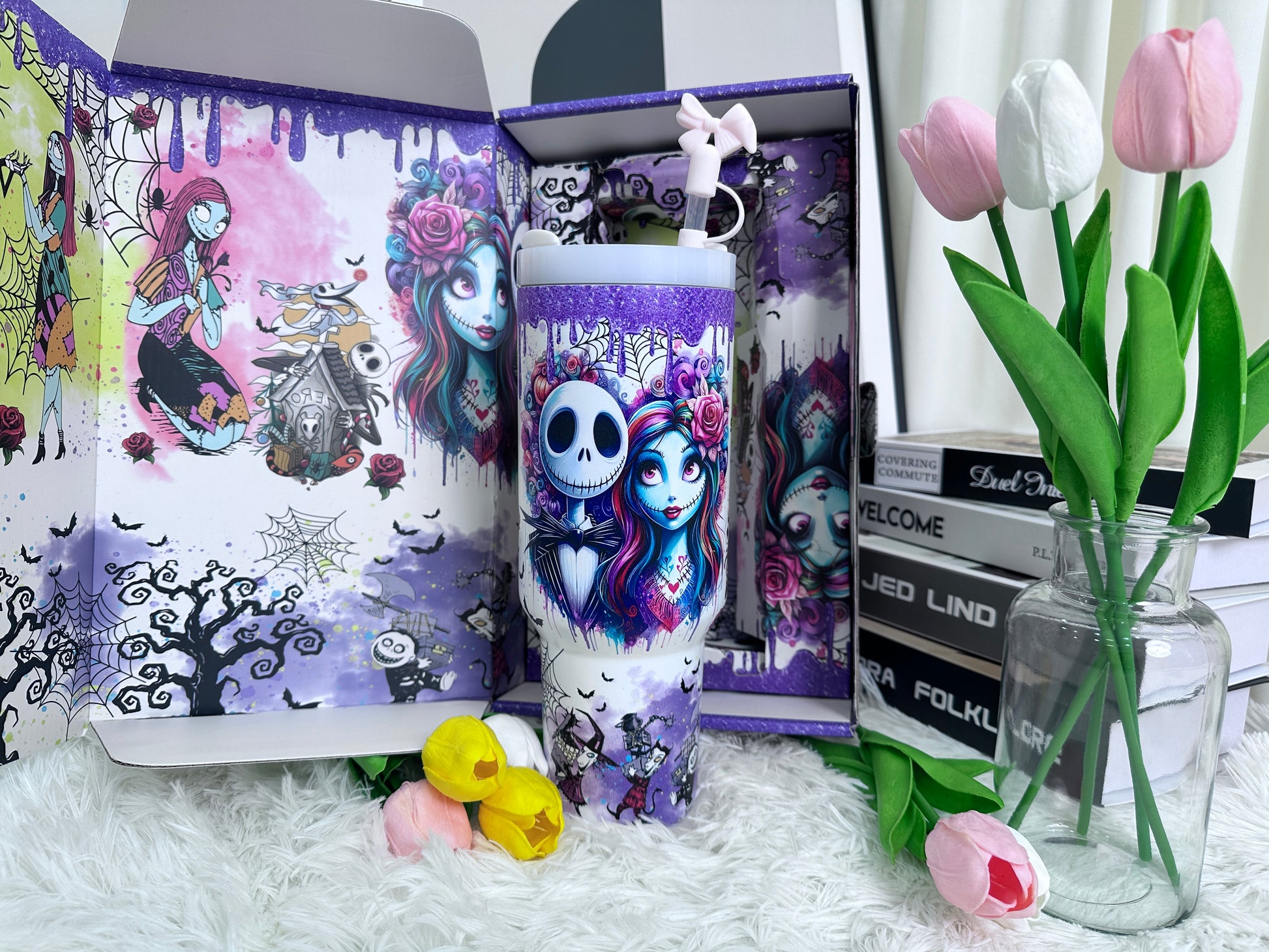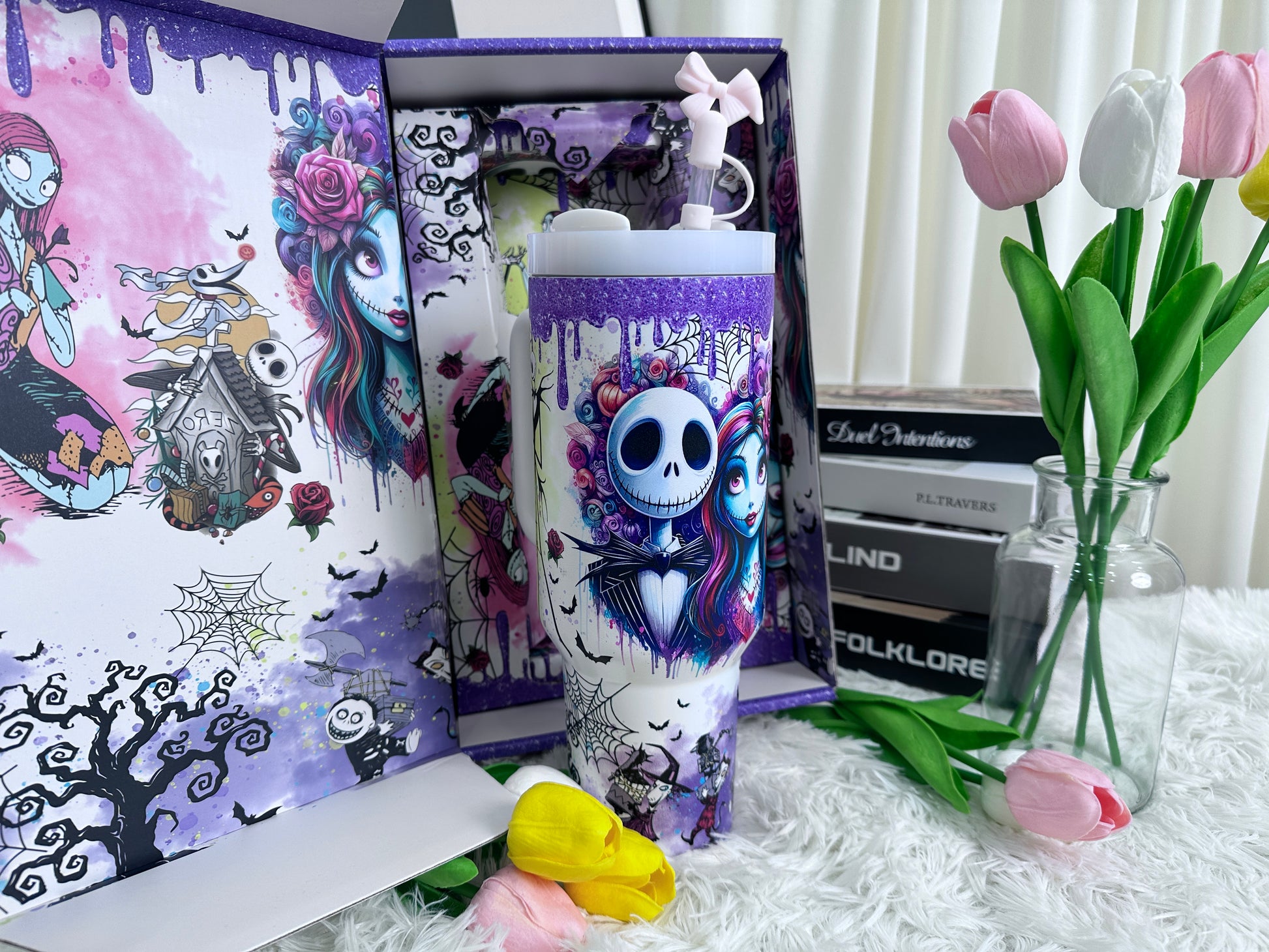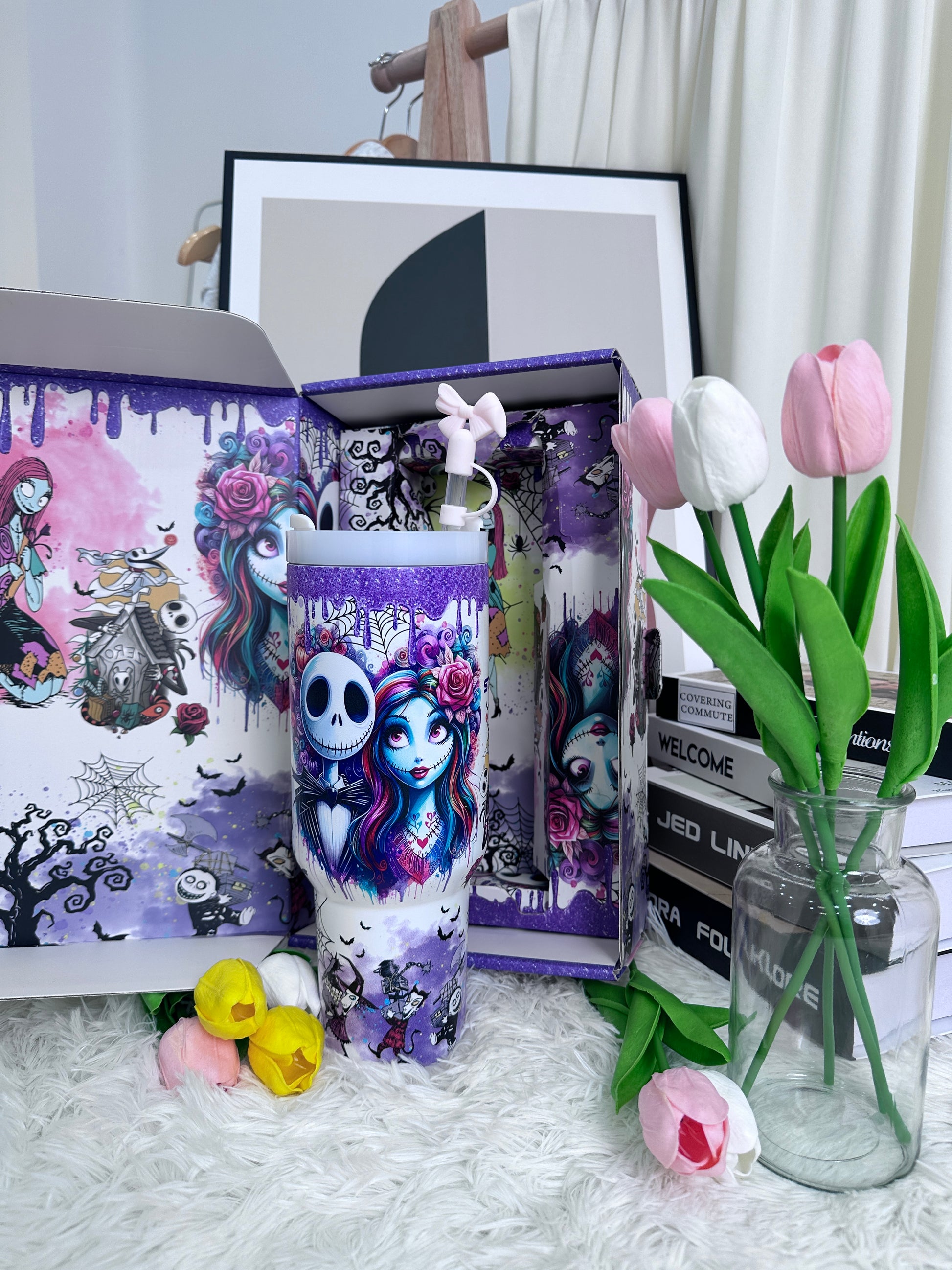 The cup features a dreamy purple gradient finish with whimsical artistic illustrations, creating a stylish yet playful look.
